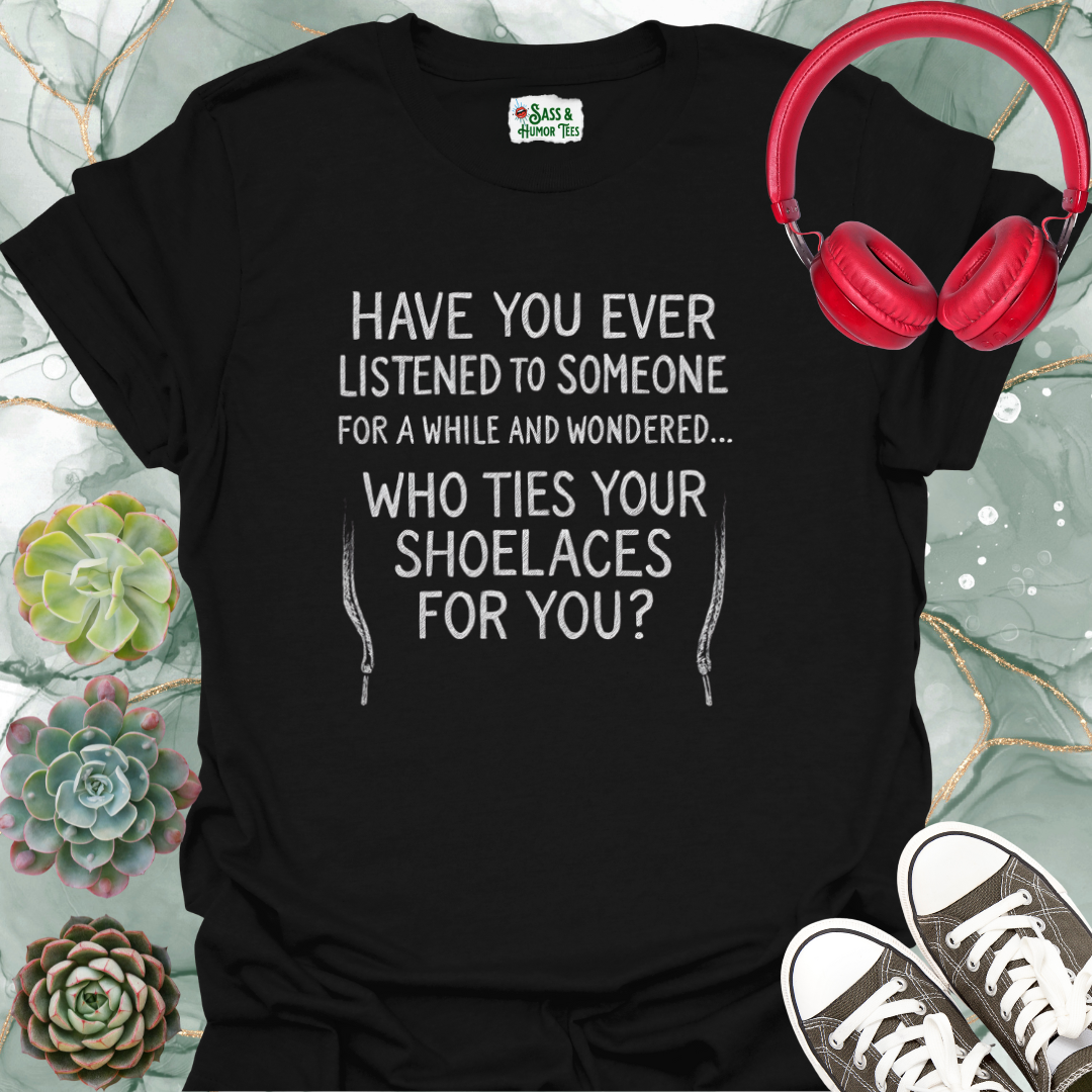 Have you ever listened to someone for a while and wondered... Who ties your shoelaces for you? T-Shirt.